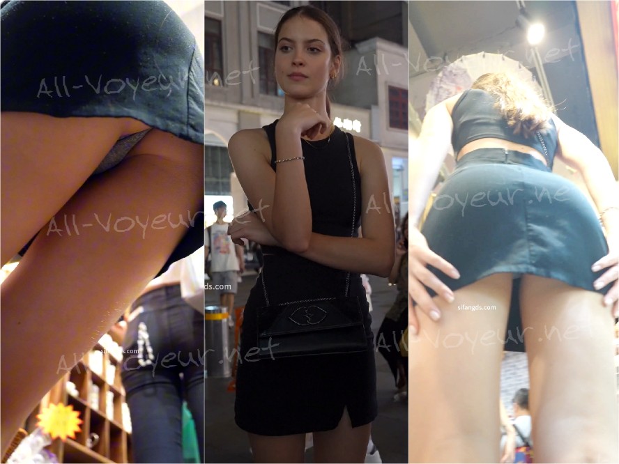 三个长腿外国模特逛街,其中一个穿着包臀裙,警惕性很强,经常用手捂裙子,然而还是被抄底骚丁字裤。